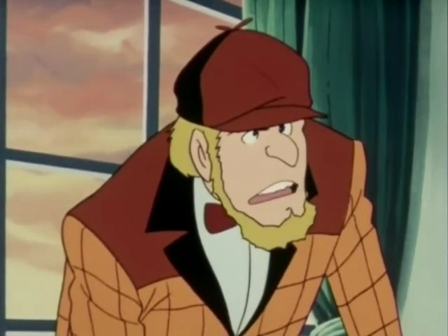 As Dobon fired his acidic seeds on the floor, Holmes sat on his chair looking bored as Lupin demands to sign the note. Dobon managed to take Jigen out with a punch and melted his magnum with his acidic seeds. Holmes got up and put his hands on the desk smiling that he has the upper hand however Lupin decides to have a smoke instead, with a worry he saw Lupin take on Dobon as a needle caught his acidic seeds landing on his nose then a kick to the face to knock Dobon out. Holmes was sweating and had a nervous smile as Lupin was ready to throw him some darts, he then decided to take a feather ready to sign to note. Lupin banged his fist demanded to sign however they heard a laugh coming from another room causing Lupin to kick the door down.