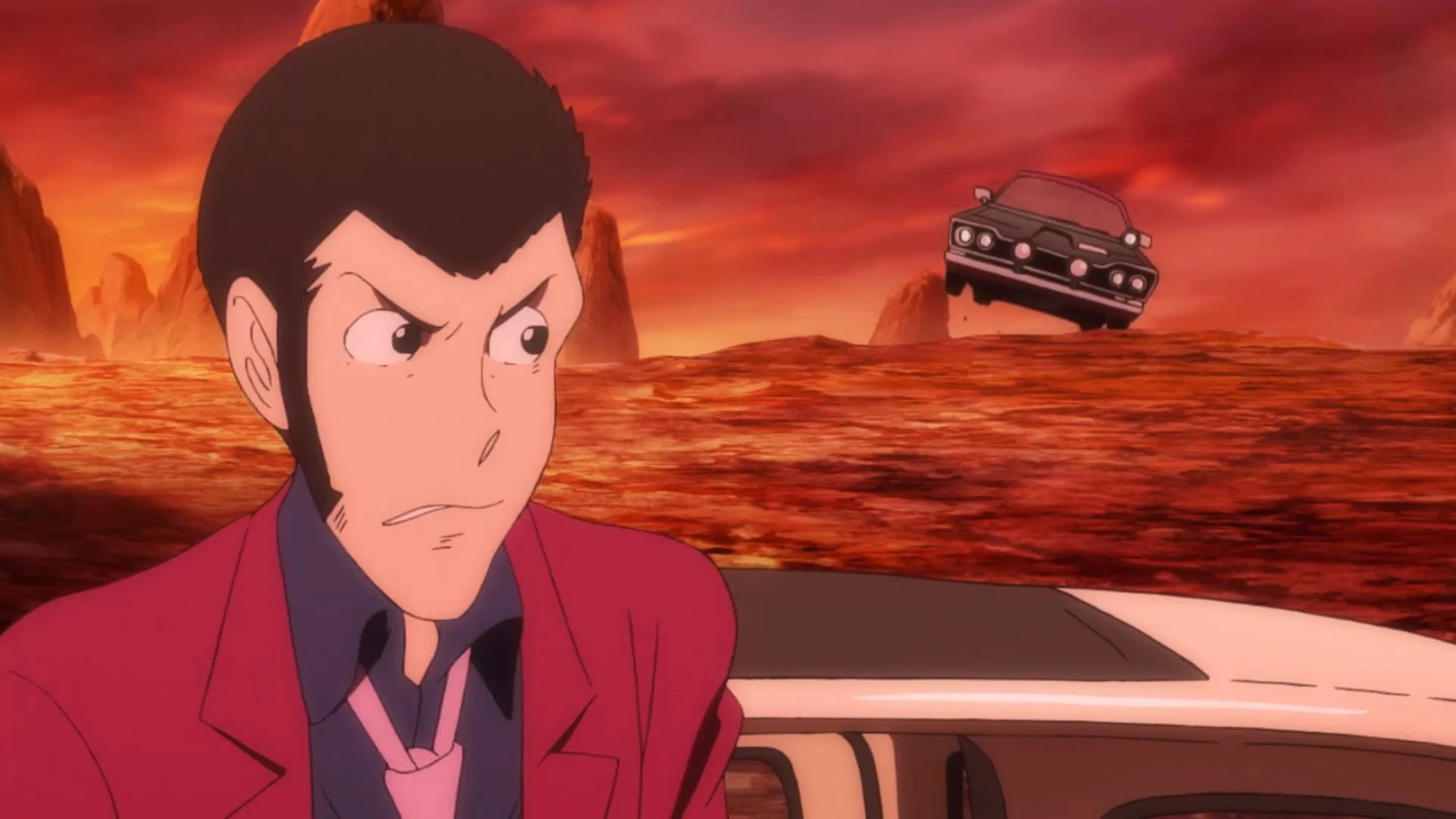 Lupin is then transported into another time period where his jacket is red. He encounters Jigen who attempts to steal his car, not knowing who Lupin is yet. Lupin offers to drive him to where he wants to go, where he meets a man to face off. Lupin waits in the car a distance away from them. They draw and Jigen is shot directly in the arm. This causes present day Jigen to disappear in front of Goemon. Kyosuke Mamo explains that when Lupin changes the past, the present does as well.